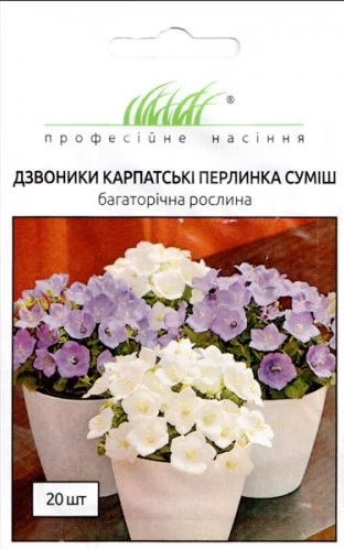 Дзвіночок карпатський Перлина (Campanula carpatica Pearl) Багаторічна карликова неперевершена рослина з тоненькими облиствленими стеблинками, заввишки досягає до 30 см, в діаметрі до 35 см. Квіточки чарівні, великі (до 5 см.) у діаметрі. Рясно розгалужений, невибагливий у вирощуванні кущ, який розростається пагонами. Рекомендації з вирощування: Насіння висівають у парник вже починаючи з кінця березня-квітень місяця. Зростання сіянців досить повільне. Тому розсаду необхідно підрощувати. Віддає перевагу родючим, лужним, пухким ґрунтам, забезпеченим хорошим дренажем. В оптимальних для рослини умовах, карпатський дзвіночок може рости до 6 років. Дуже сонцелюбна рослина. Використання: Дуже добре підходить для оформлення квітників, бордюрів, рокаріїв. Дуже красиво виглядає в горщиках.