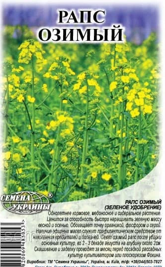 Однорічна кормове, медоносна і сидеральноє рослина . Цінується за здатність швидко нарощувати зелену масу наВагані і восени. Збагачує грунт органікою, фосфором і сіркою. Наявність ефірних масел є профілактичним засобом від накопичення шкідників і хвороб. Сіють озимий ріпак після збирання основних культур, у 2-3 декаді серпня на глибину близько 2 см. Скошування і закладення проводять за місяць перед посадкою розсадних культур культиватором або плоскорізом Фокіна. Вага нетто: 1 кг