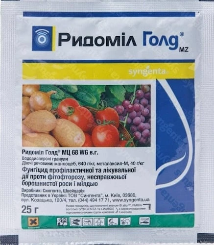 Ридоміл Голд - комбінований фунгіцид контактної та системної дії для боротьби з хворобами картоплі, томатів, огірків, винограду, цибулі, ріпаку, хмелю.