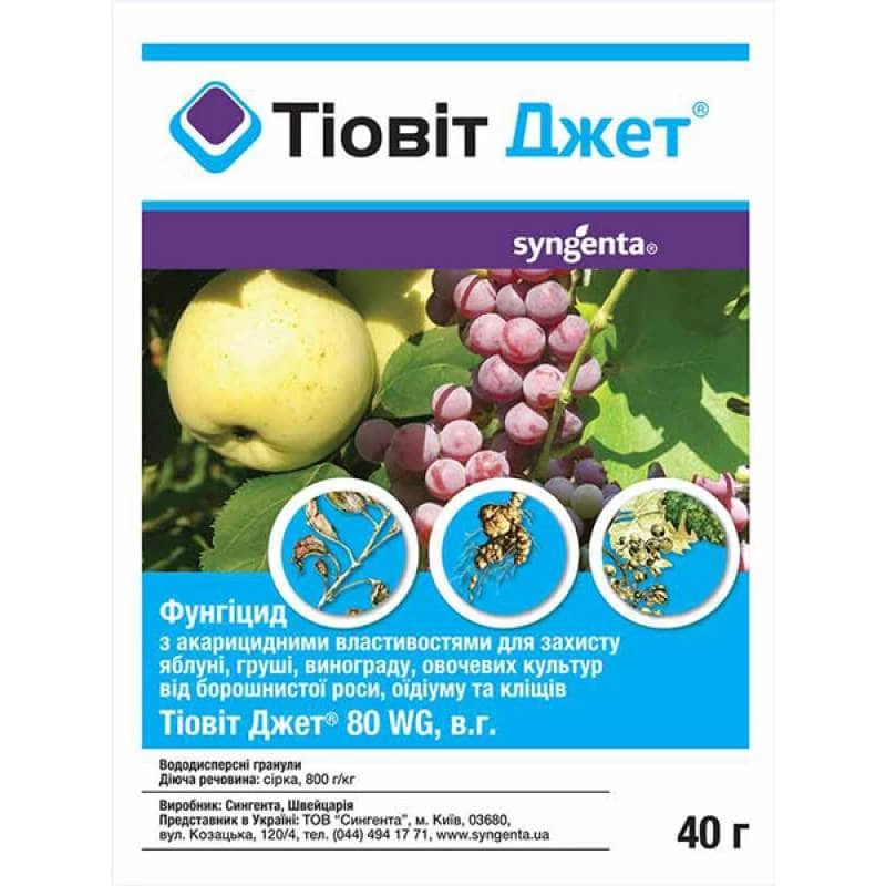 Тіовіт Джет - контактний фунгіцид-акарицид для захисту плодових культур і винограду від борошнистої роси й кліщів.