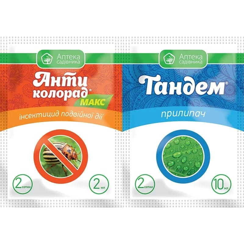 Антиколорад Макс + Тандем - Бінарний комплект високоефективного контактно-системного інсектициду подвійної дії проти широкого спектру шкідників з прилипачем для подовження та підвищення дії у несприятливих умовах.