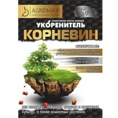 Регулятор росту укорінювач Корневін - стимулятор росту коренів, який призначений для покращення вкорінення живців та саджанців плодових, ягідних, цитрусових, хвойних, декоративних культур, кімнатних рослин, виноградної лози, розсади овощних та декоративних рослин, а також поліпшення їх приживлюваності при пересадках, .ч. сіянців та саджанців. Гарантує приживлюваність всіх видів рослин при пересадці. Аналог гетероауксину.