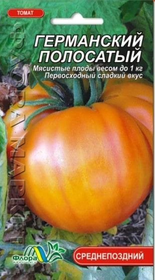 "Німецький смугастий" (German striped) - середньопізній сорт салатного призначення з дуже великими плодами оригінального забарвлення. Кущ середньорослий, висотою до 1,2 м. Плоди округлоплоскі, трохи ребристі, помаранчево-жовтого кольору з рожевими розмитими смугами - дуже декоративні! Маса зрілих плодів досягає 1000 г, але нерідко формує томати вагою і до 1500 г! Консистенція плодів м'ясиста, соковита, цукрова. Смак дуже приємний, солодкий з фруктовими ароматами. Має дієтичні властивості. Сорт характеризується винятковою врожайністю і хворобостійкістью. Використовується для споживання у свіжому вигляді та переробки.