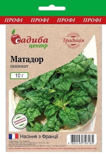 Шпинат Матадор - середньопізній високоврожайний сорт, призначений для посіву навесні та восени. Вегетаційний період при весняному посіві складає 55 днів, при осінньому - 250. Рослина середнього росту, з яскраво-зеленим нерівномірно гофрованим листям.